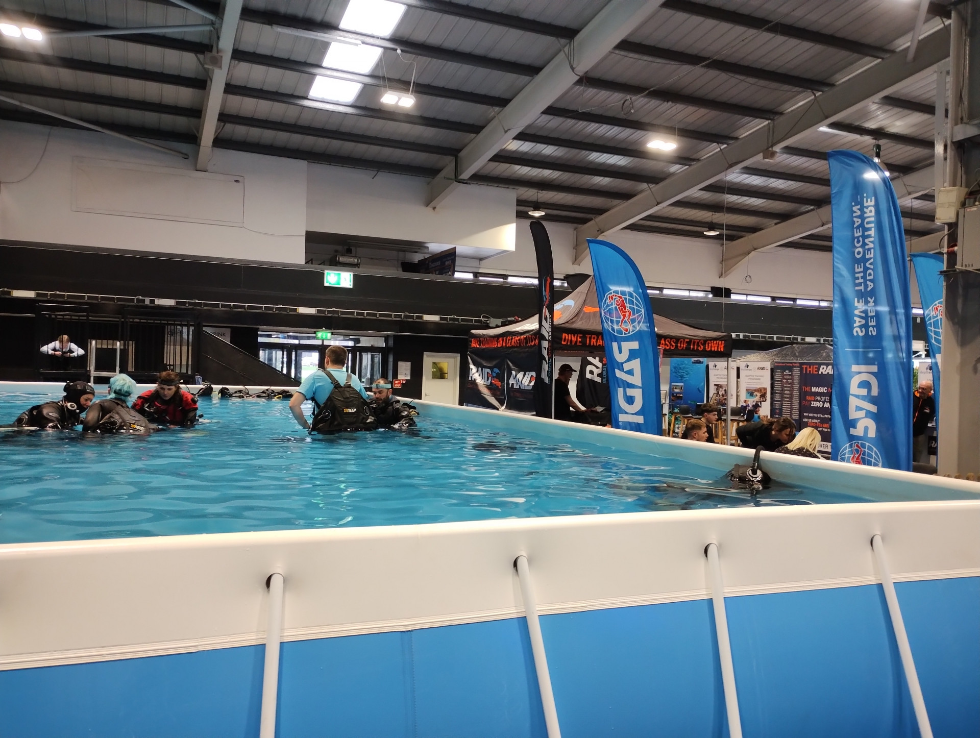 There was a portable pool for various try dive options and our own James S took the plunge to try sidemount diving. Unfortunately, having said there was no need to bring a suit the organizers omitted to tell him the pool was stone cold and basically straight out of the tap. I think he found the experience rewarding but it was hard to tell due to his funny colour and chattering teeth afterwards!